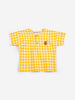 The Pixel Strawberry Vichy Woven Blouse by Bobo Choses is a baby blouse in a sunny yellow and white gingham with a small embroidered pixel strawberry on the chest. The strawberry is stitched in red and green with a cross-stitch quality that ties into the collection's graphic, handmade feel.