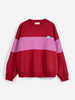 The Color Block Relaxed Sweatshirt by Bobo Choses is a burgundy pullover with a wide pink stripe across the chest and sleeves. A small turquoise Bobo Choses logo patch sits at the edge of the stripe, adding a hit of contrast.