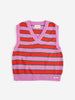 The Striped V-Neck Vest by Bobo Choses is a knit vest in bold pink, red, and green stripes. The textured stitch gives it a slightly nubby feel, with ribbed trim at the V-neck, armholes, and hem. A small embroidered Bobo Choses logo sits at the bottom front.