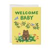 The Baby Cub Greeting Card by Red Cap Cards is a soft yellow new baby card showing a small brown bear cub sitting in a patch of grass, eyes closed, surrounded by wildflowers, mushrooms, and an acorn. Two bluebirds perch on a leafy branch overhead and a third swoops in from the left. "WELCOME BABY" is printed in bold green letters at the top. Illustrated by Danielle Kroll.