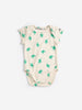 The Hopping Frog All Over Body by Bobo Choses is a short-sleeve baby body in white with an all-over print of little green frogs mid-leap. Each frog has its own pose — legs outstretched, arms wide, tiny smile — scattered across the fabric at different angles. Envelope neck and snap closures at the crotch.