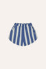 The Blue Stripes Washed Shorts by The Campamento feature bold vertical stripes in blue and off-white with a soft, washed finish. The relaxed pull-on style has an elastic waistband, side pockets, and a small logo print on the front. A classic summer short with vintage appeal.