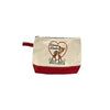 The Deerest Darlin' Utility Pouch by Patch Ya Later is a canvas zip pouch in cream with a red base and a red wrist strap. The front is embroidered with a spotted fawn standing inside a red heart, surrounded by daisies. It closes with a silver zip and metal loop pull.