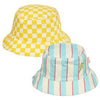 Rockahula's Lightning Stripe Reversible Bucket Hat is a two-in-one sun hat with plenty of personality — yellow and cream checker on one side, blue and pink candy stripes with an embroidered lightning bolt badge on the other. The wide brim offers solid sun coverage, and the soft recycled outer fabric means it's comfortable enough to actually keep on.